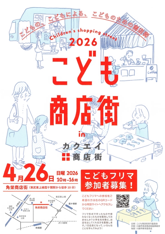 こども商店街は、川越市の霞ヶ関北部エリアにある角栄商店街で開催される「こどもの、こどもによる、こどものためのお祭り」です。イベント当日は商店街の道路は歩行者天国となり、多くのこども達の笑顔が商店街を彩ります。